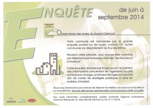 L’Observatoire de l’habitat du Grand Clermont, piloté par Clermont Communauté, Riom Communauté et le Grand Clermont, lance sa troisième enquête relative à l’évolution des loyers 2014, du parc privé sur l’ensemble des 108 communes du Grand Clermont.